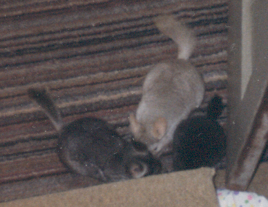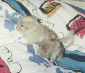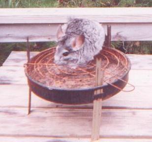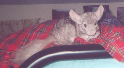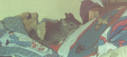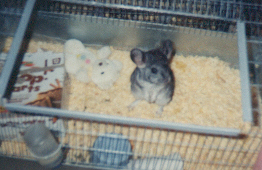 Unfortunately, although chinchillas rarely get sick, Eve was one of the select few. She died suddenly on February 20, 1998. Chinchillas usually live at least until they are 15, so losing Eve at such a young age was heartbreaking. It was also devastating for Dweezle, who had lost a mate before, this loss made him crankie and miserable for months, we were almost afraid that he wouldn't recover from it. After describing the symptoms surrounding her death to a breeder I was informed that it was probably a seizure, something that is currently impossible to treat in chinchillas.