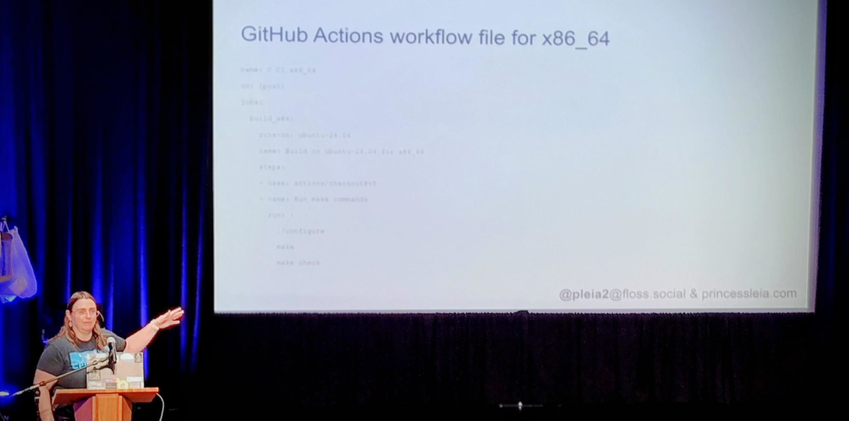 Speaking of multiarch, I then enjoyed a talk by Amy Parker whose talk focused on QEMU user mode. I’ve used QEMU on and off over the years, but honestly since I’ve shifted my focus to bare metal testing, I’ve used it a lot less. I don’t have a lot of experience with the user mode emulation that she covered, which made the talk a fascinating dive through binfmt_misc, ld_preload, and chroots to accomplish a lot of interesting work across architectures. She also talked about using FatELF to create universal binaries, which wasn’t even on my radar. So many fun things to dig into!