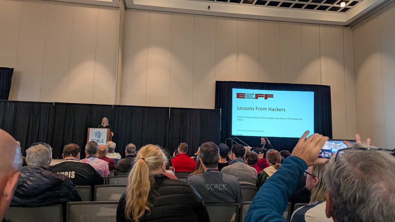 The keynote from Cindy Cohn, Executive Director of the EFF, on Saturday morning was wonderful. I’ve been a supporter of of the EFF for years, and am closely aligned with most of their views. It was fascinating to hear about her work in this space, and the fundamental protections that she’s worked to help pioneering technologists secure over the years. I vaguely knew that encryption was restricted by the US government in the earliest days of the internet, but I didn’t realize it was classified as munitions which ultimately meant that encryption algorithms couldn’t be shared and collaborated on online. Wow. Could you imagine the internet without encryption? Our world? Cindy, with an army of early free software hackers, argued in federal court in San Francisco and for over a decade beyond that to make sure encryption was freed from this classification. This story was the first of three that she dives into in her new book Privacy’s Defender: My Thirty-Year Fight Against Digital Surveillance which I promptly pre-ordered. Her call to action to us hackers today was to stay engaged in this fight so that we show up for all the future legal battles that have the potential to threaten the future of our world and lives with regard to digital freedom. I had the pleasure of running into her later in the conference to thank her for her talk, and I had the presence of mind to pull out a piece of paper to have her sign so I could put it in my book when it arrives; I’ll have a signed copy, kind of! Then I went to the EFF booth to do my annual contribution.