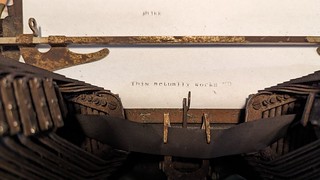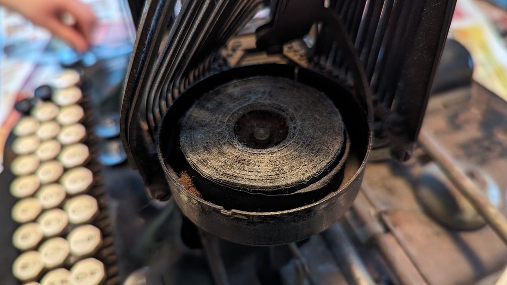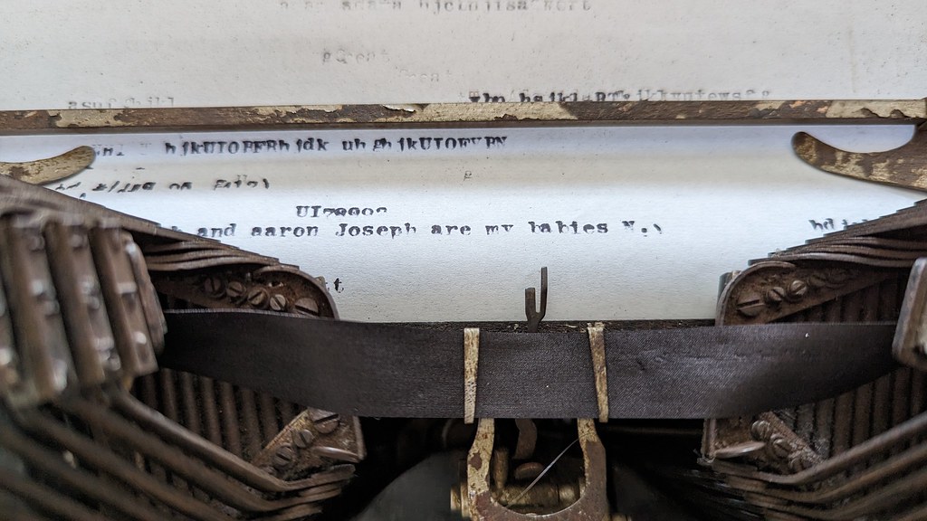 A quick trip back over to The Vintage Type, we watched Installing a New Ribbon on an Oliver typewriter and I was able to glean enough of an understanding of installing the ribbon that I could get this old one installed again. As an aside, I learned later that this video from the same channel is better for me, since I have an Oliver 9 and he shows specifically installing one of those there. Notably, I missed the detail of making sure the ribbon was tucked inside the bottom of the clips to hold it in place, which you can notably see when I finally got to type something, but it worked!
