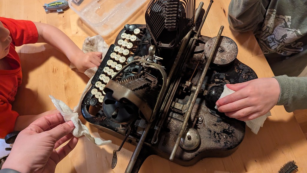 From there, I brought the typewriter back out to the dining room table so the boys could help me take some soap and water to it to remove all the rust dust and generally get it cleaned up. I will note that the bottom of it seemed to be in pretty good shape with only some minor spots needing attention.