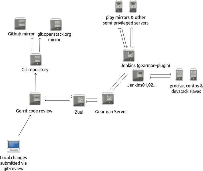 - Jenkins (with jenkins-job-builder*, devstack-gate*)